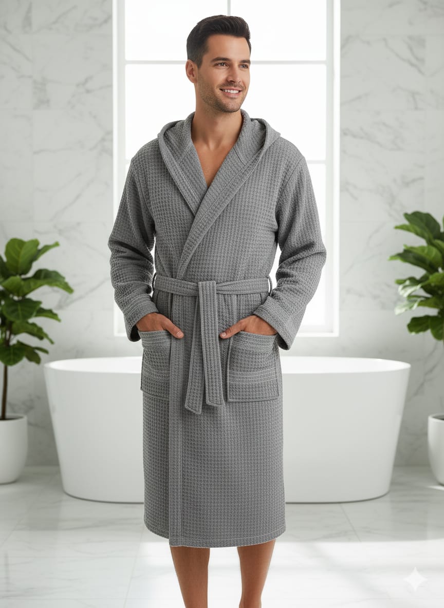 Accappatoio realizzato in puro cotone con caratteristica trama a nido d'ape, che combina eleganza e funzionalità. La struttura geometrica della trama favorisce l'assorbimento rapido dell'umidità e garantisce un'asciugatura veloce, mantenendo al contempo una sensazione di leggerezza sulla pelle. Ideale per chi apprezza capi versatili, resistenti e facili da mantenere nel tempo.