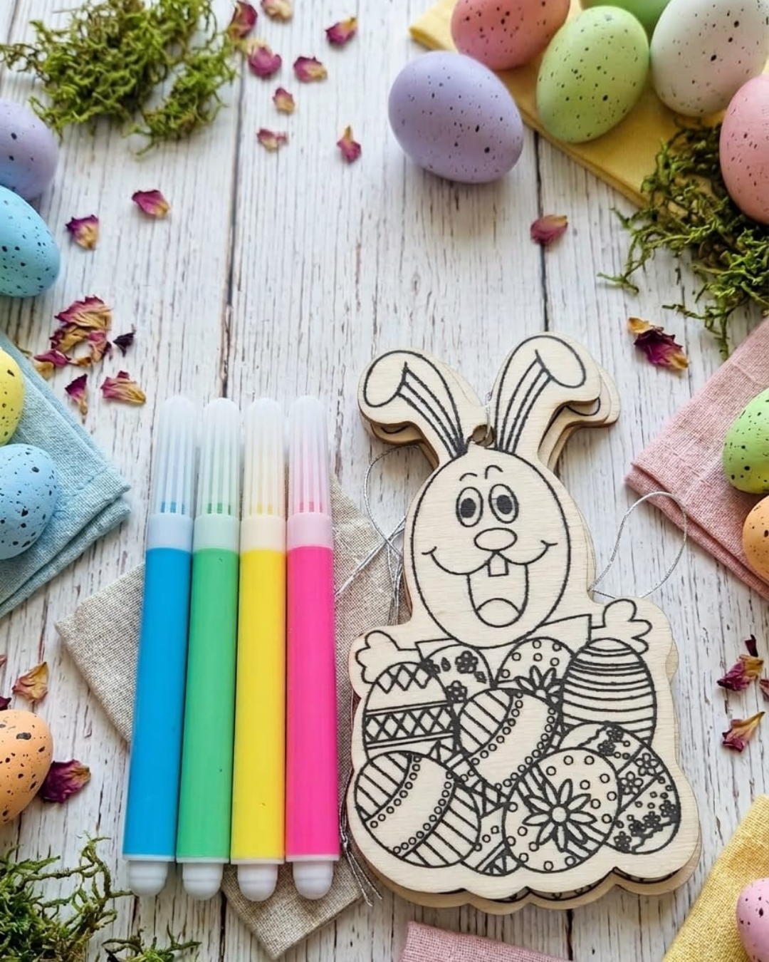 Adorabile coniglietto pasquale realizzato in legno, perfetto per stimolare la creatività dei bambini. Pronto da colorare con pennarelli, offre ore di divertimento artistico durante le festività pasquali. Un'attività educativa che combina gioco e fantasia, permettendo ai bambini di personalizzare il loro coniglietto con i colori preferiti. Perfetto come regalo pasquale originale o come intrattenimento per feste e laboratori creativi.